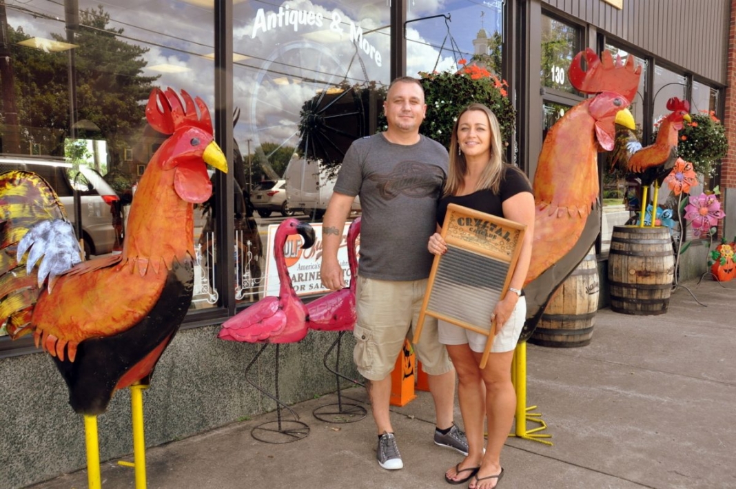 Visitors might not come inside but often stop to have their pictures taken with the large lawn ornaments displayed on the sidewalk out front, notably posing with large metal roosters that have become a popular product.