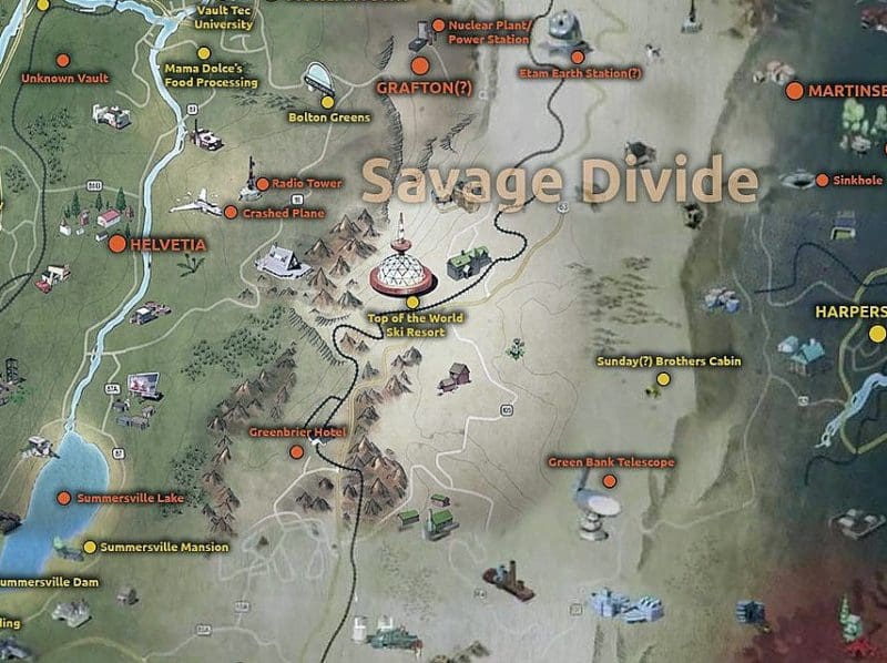 Fallout 76 map of Savage Divide by WVExplorer | Oct 23, 2018 | 0 comments Highlights from a Fallout 76 map of the Savage Divide pay homage to the Allegheny Mountain region. Submit a Comment Cancel replyYour email address will not be published. Required fields are marked *Comment * Name * Email * Website Save my name, email, and website in this browser for the next time I comment. Δ