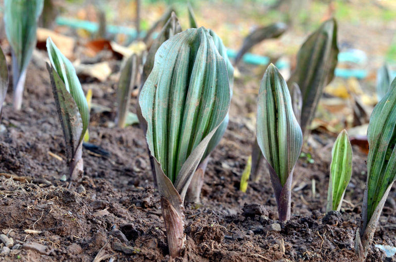 Single leaves of the Aplectrum hyemale plant appear in a garden planting.