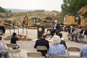 Accompanied by his boxer, Babydog, Governor Justice addresses dignitaries at the groundbreaking. (Photo courtesy W.Va. Dept. of Commerce)