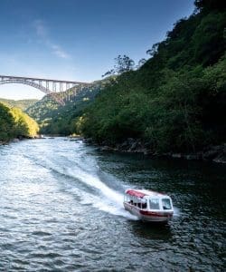 Boat tours transport sightseers to view of New River Gorge Bridge