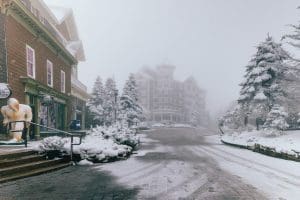 The first snow of the 2024-2025 ski season dusts the Village at Snowshoe. (Photo courtesy Snowshoe Mountain)