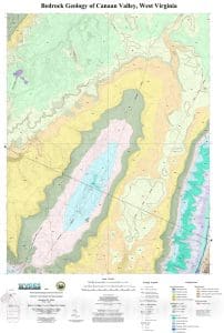 A geologic survey map of Canaan Valley geology represents the oval-shaped valley on the line of the Allegheny Front to the East. (Map courtesy W.Va. Geologic Survey)