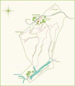 Similar, though smaller, rock formations can be found along the line. Turkey Rock and Black Rock are located within the park. Black Rock, to the northeast of Pinnacle Rock, is the most lofty and was first known as “The Pinnacle.” No official park trail leads to it. Turkey Rock is smaller, a half mile southwest of Pinnacle Rock, and is the focus of the park’s 1.5-mile Turkey Rock Trail.