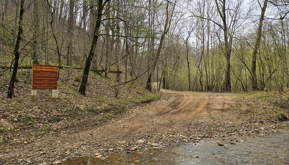Wirt County Route 34 fords Two Run at the western entrance to the Little Kanawha River Wildlife Management Area.