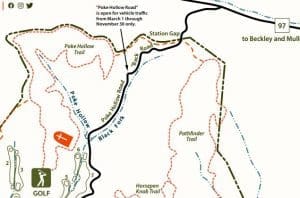The Poke Hollow Trail ascends from the Black Fork to the ridge at the north boundary of Twin Falls State Park.