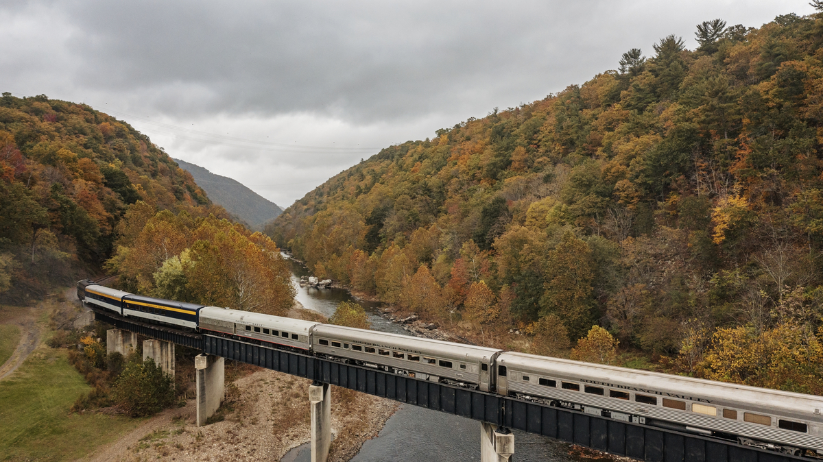 The Potomac Eagle glides through the mountains of eastern West Virginia on a fall foliage excursion. (Photo courtesy W.Va. Dept. of Tourism)