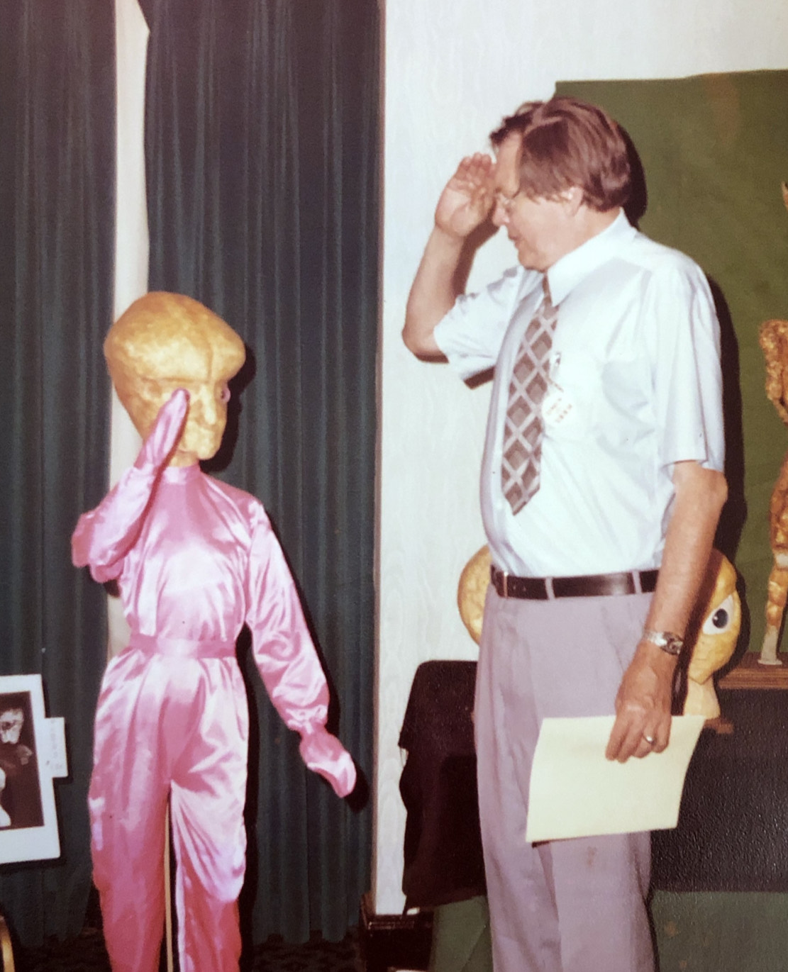 Barker salutes a friendly alien. (Image courtesy of Michael Strayer)