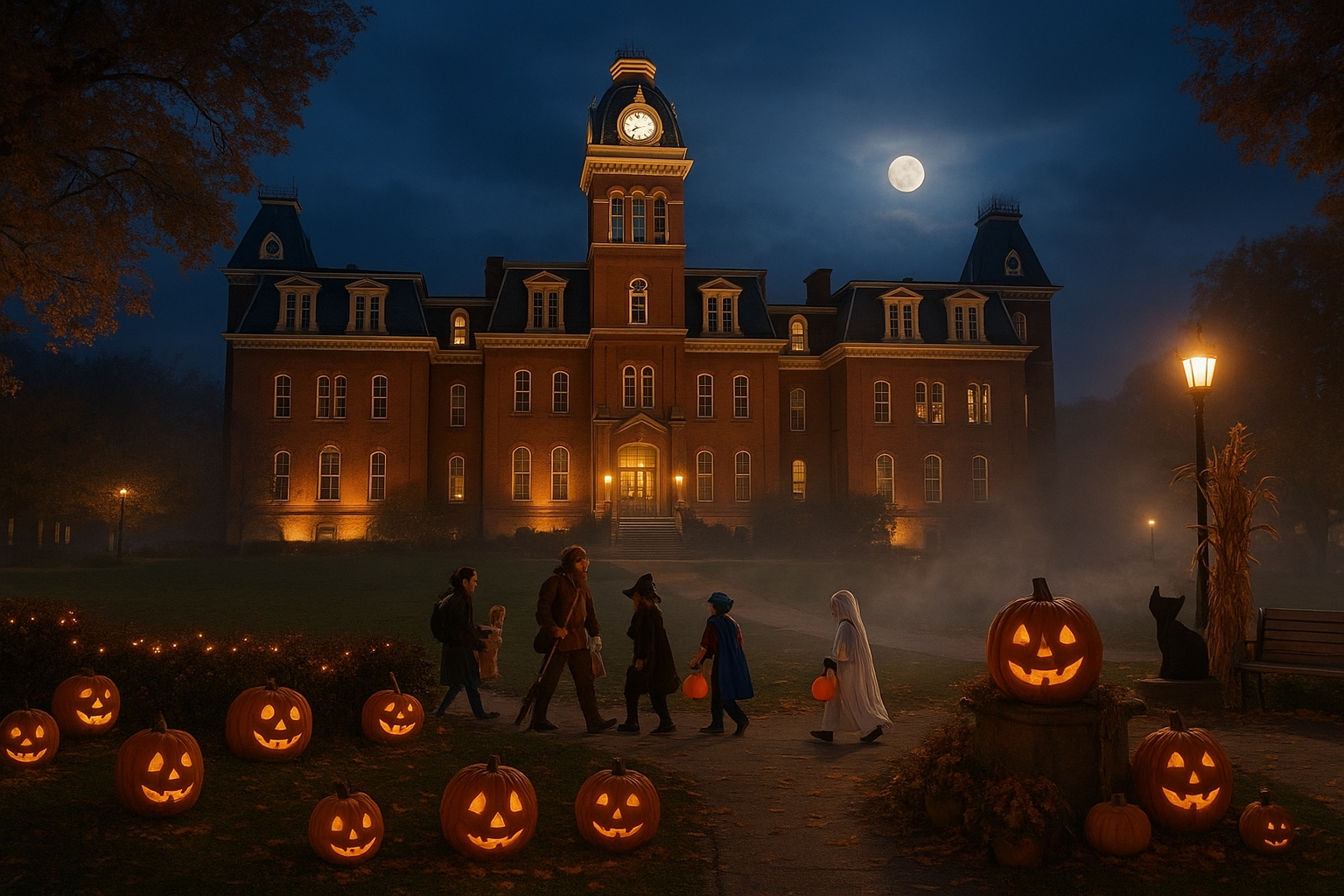 Woodburn Hall at West Virginia University looms over a Halloween scene. (AI rendering by David Sibray)