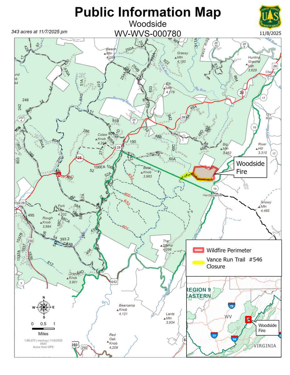 Home Woodside Fire in West Virginia national forest reaches 75% containment Map showing Woodside Fire