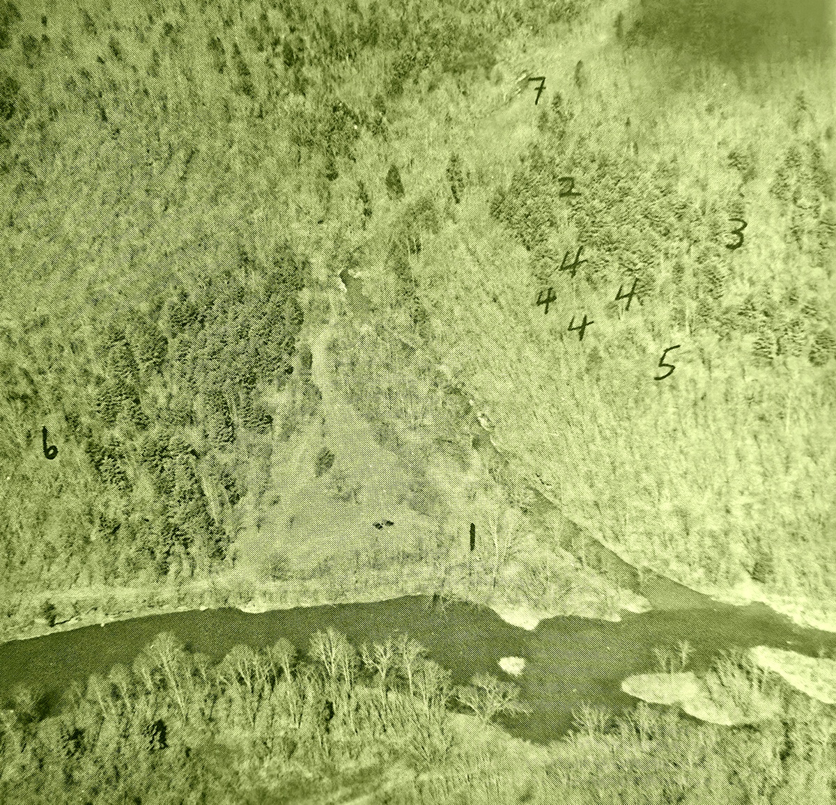 An aerial photo provided by Sanders designates 1.) Josiah Meador Store, 2.) Church, 3.) School, 4.) Lilly Cemetery, 5.) Robert Lilly Residence, 6.) Meador Cemetery, 7.) the Turn Hole.