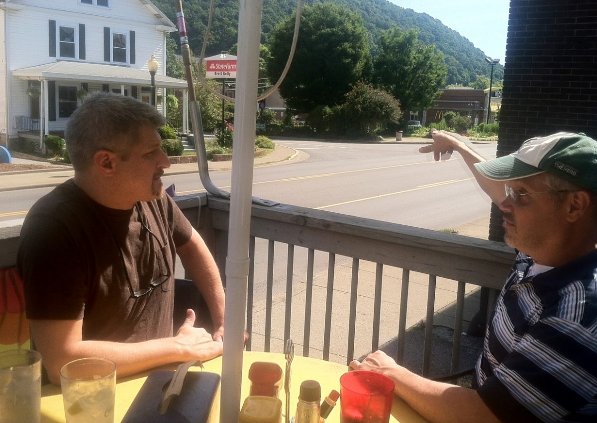 Editors David Sibray and Michael Friel review plans for a content management system over lunch at cafe in Charleston, WV.