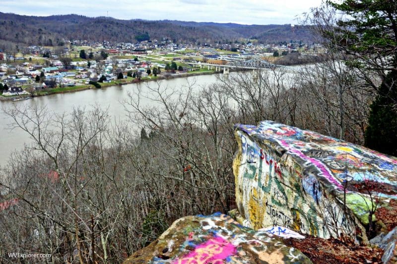 A steep path wanders up from the base of the ridge near the Putnam County Animal Shelter to the ridge top and rocks, the tops of which have been marked with graffiti over many years. Many chiseled inscriptions appear on the rocks alongside more recently spray-painted work. The steep ascent of more than 300 feet from the roadside to the summit is difficult.