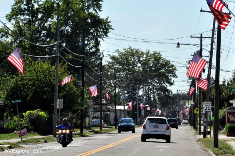 American flags fly along Fourth Steet in Paden City, West Virginia