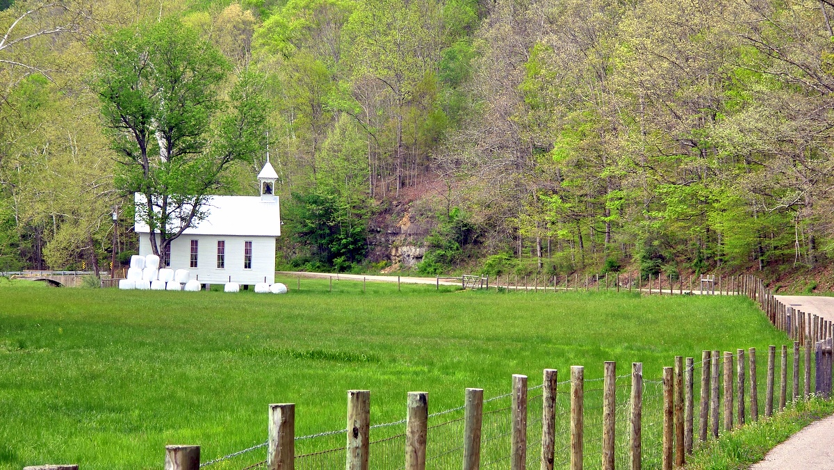 In Doddridge County, haybales await collection alongside the Locust Grove United Methodist Church.